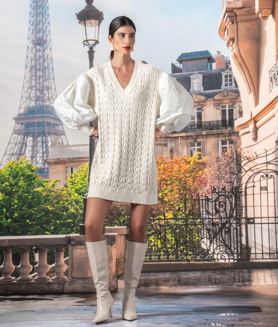 vestido em malha com decote em bico e cinto ajustável (também em malha). Racha lateral discreta.